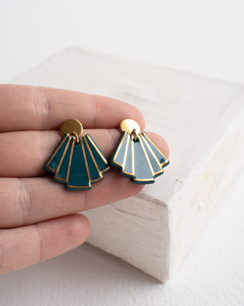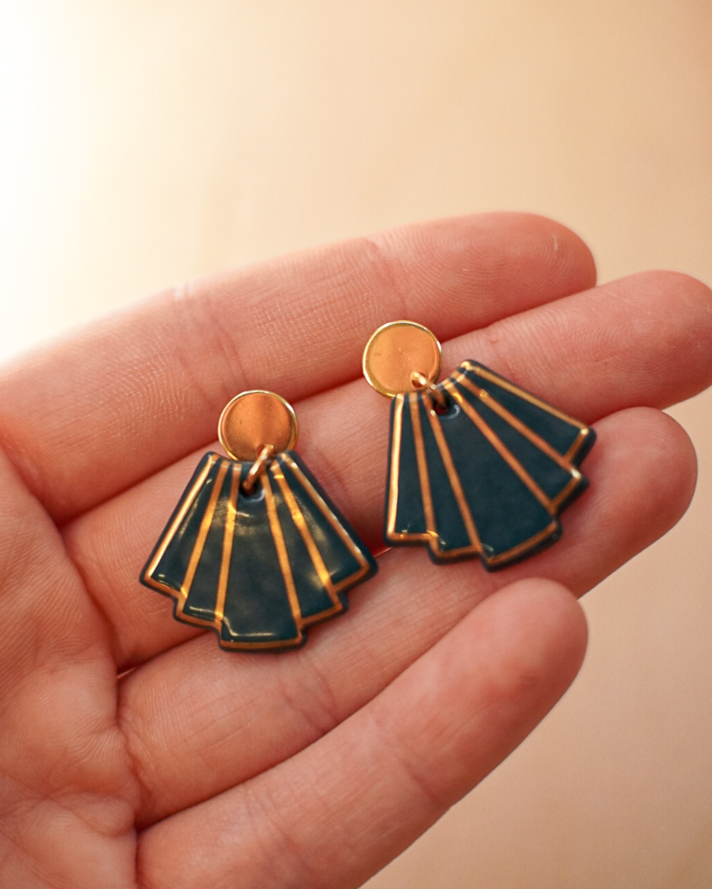 Kolczyki wiszące ręcznie wykonane z porcelany w pracowni na warszawskiej Pradze. Uformowane, wyszlifowane, szkliwione i złocone z największą starannością i czułością. Wypalone trzykrotnie w piecu ceramicznym w maksymalnej temperaturze 1250 stopni.