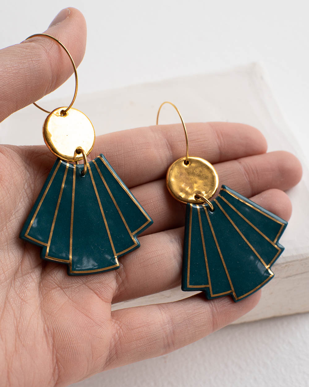 Kolczyki wiszące ręcznie wykonane z porcelany w pracowni na warszawskiej Pradze. Uformowane, wyszlifowane, szkliwione i złocone z największą starannością i czułością. Wypalone trzykrotnie w piecu ceramicznym w maksymalnej temperaturze 1250 stopni.