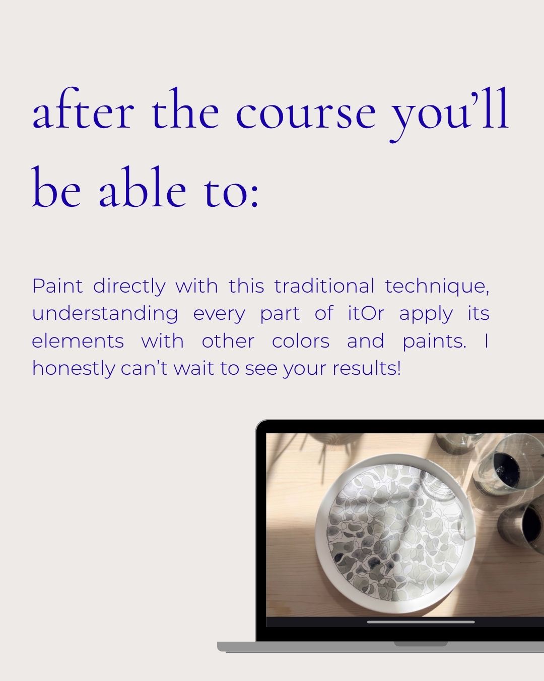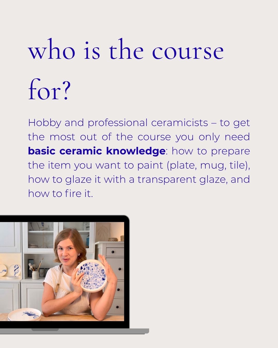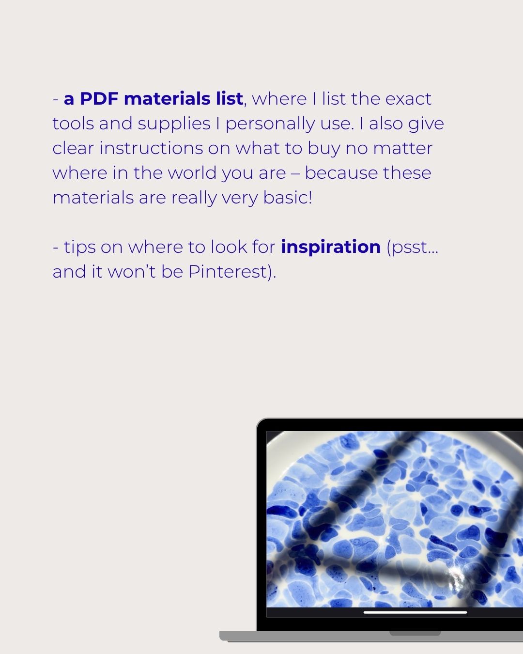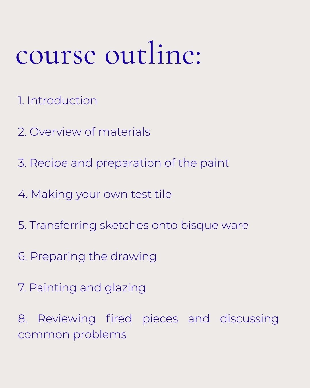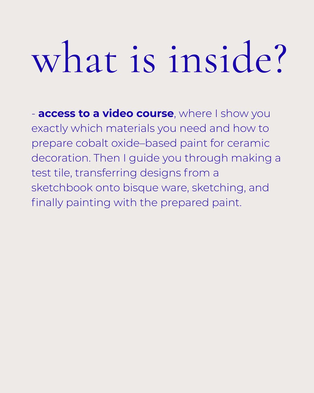 – access to a video course (in English) with English subtitles. I show you exactly which materials you need and how to prepare cobalt oxide-based paint for ceramic decoration. Then I guide you through making a test tile, transferring designs from a sketchbook onto bisque ware, sketching, and finally painting with the prepared paint.