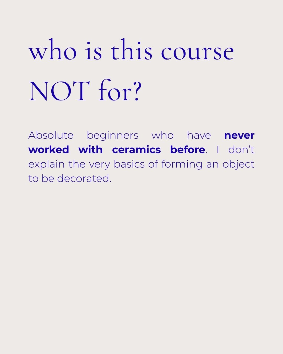 Absolute beginners who have never worked with ceramics before. I don’t explain the very basics of forming an object to be decorated.