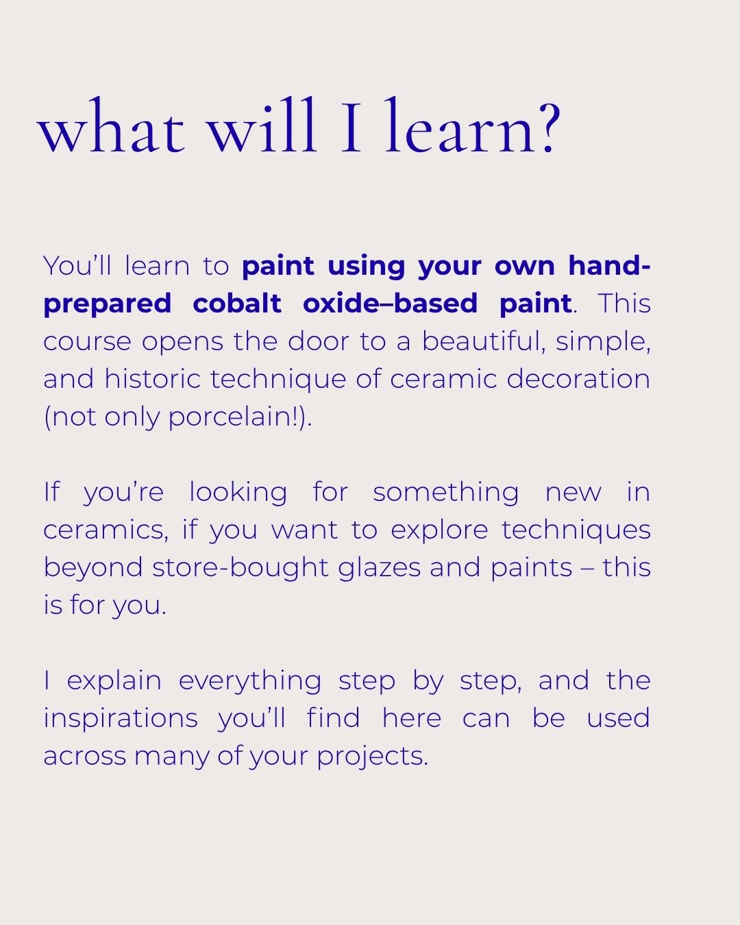 If you’re looking for something new in ceramics, if you want to explore techniques beyond store-bought glazes and paints – this is for you. I explain everything step by step, and the inspirations you’ll find here can be used across many of your projects. After the course you’ll be able to: