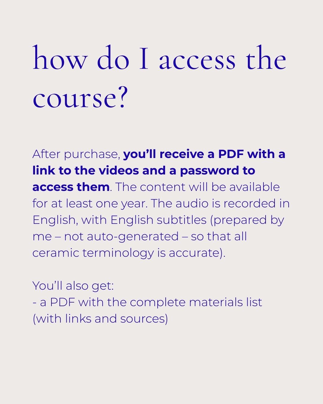 After purchase, you’ll receive a PDF with a link to the videos and a password to access them. The content will be available for at least one year. The audio is recorded in English, with both Polish and English subtitles (prepared by me – not auto-generated – so that all ceramic terminology is accurate).