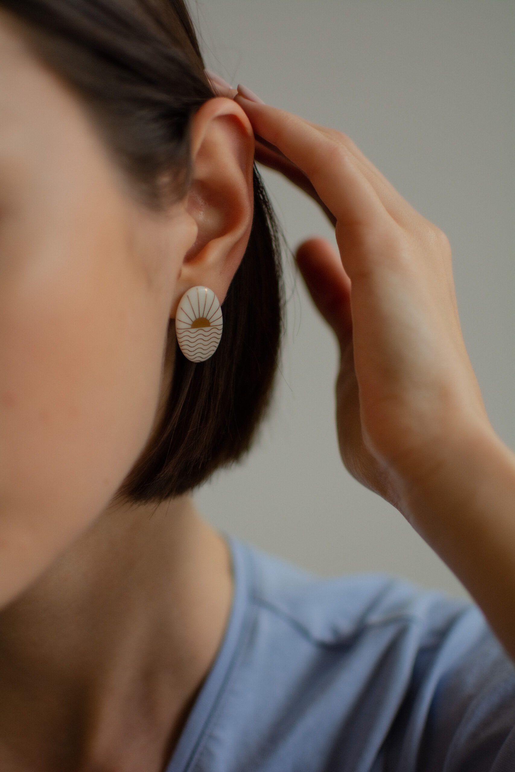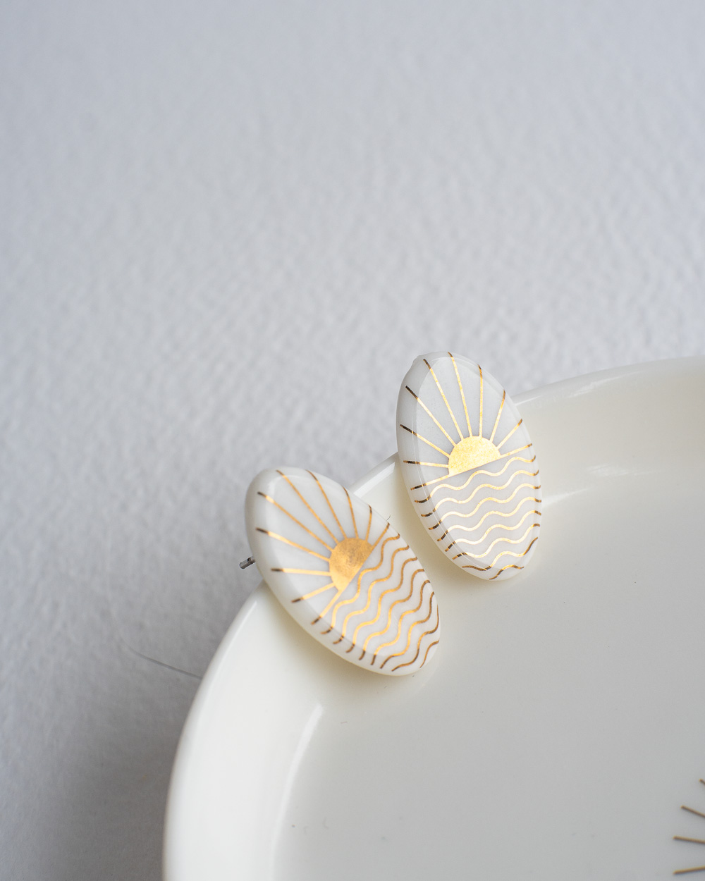 Kolczyki sztyfty ręcznie wykonane z porcelany w pracowni na warszawskiej Pradze. Uformowane, wyszlifowane, szkliwione i złocone z największą starannością i czułością. Wypalone trzykrotnie w piecu ceramicznym w maksymalnej temperaturze 1250 stopni.
