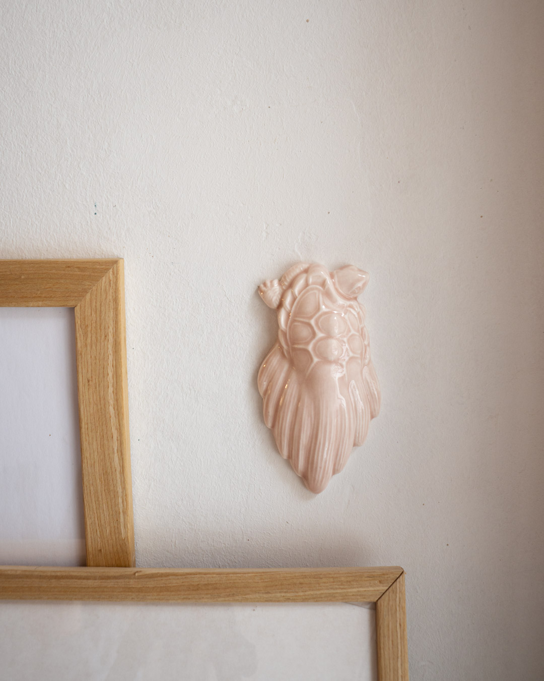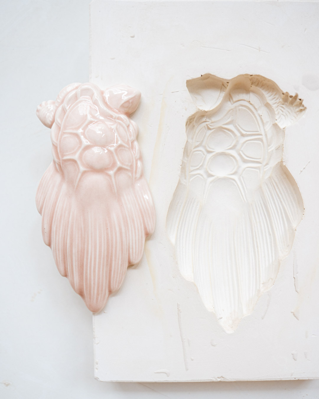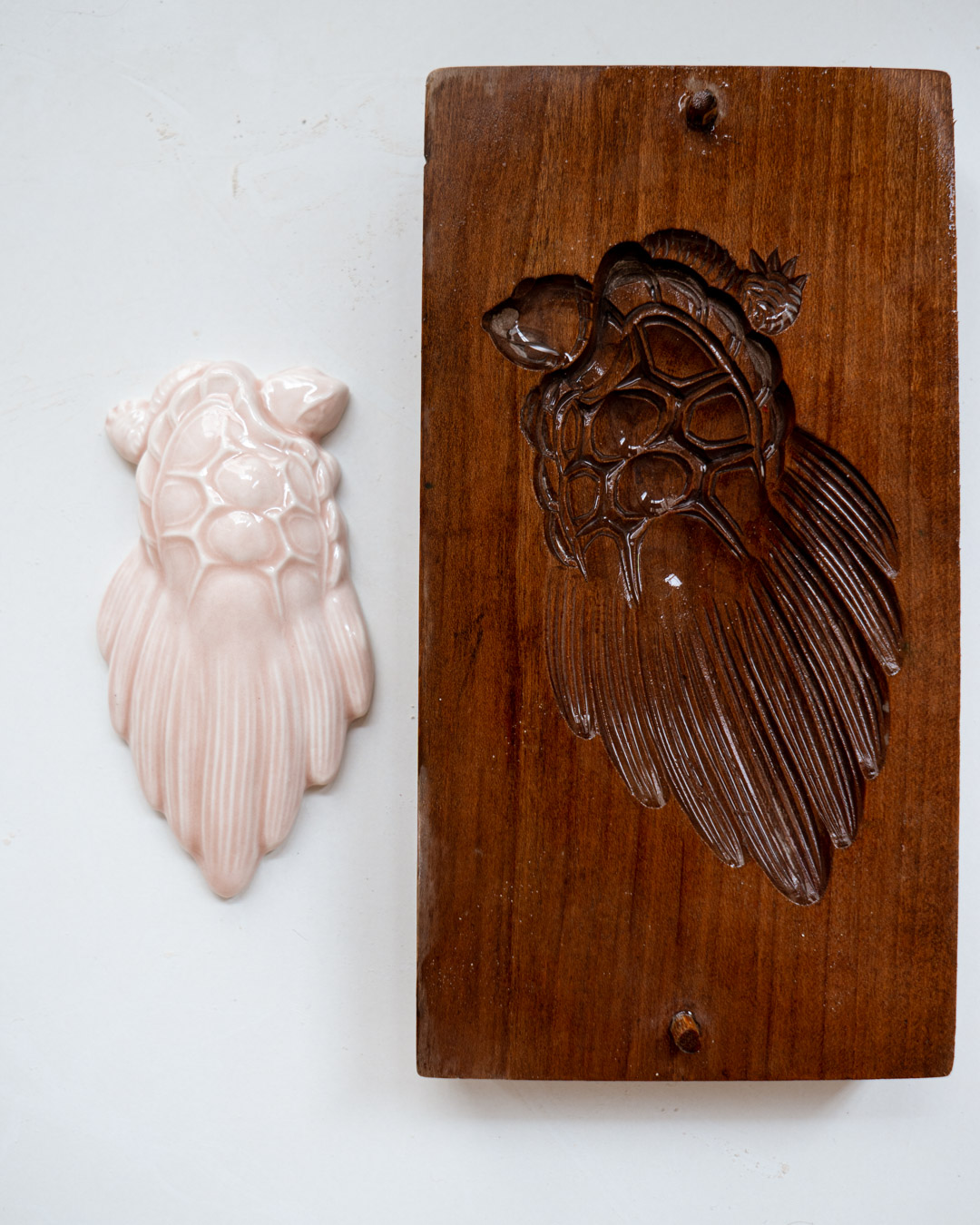 Now the turtle has its own plaster mold. It is born from it, then carefully retouched and glazed.
