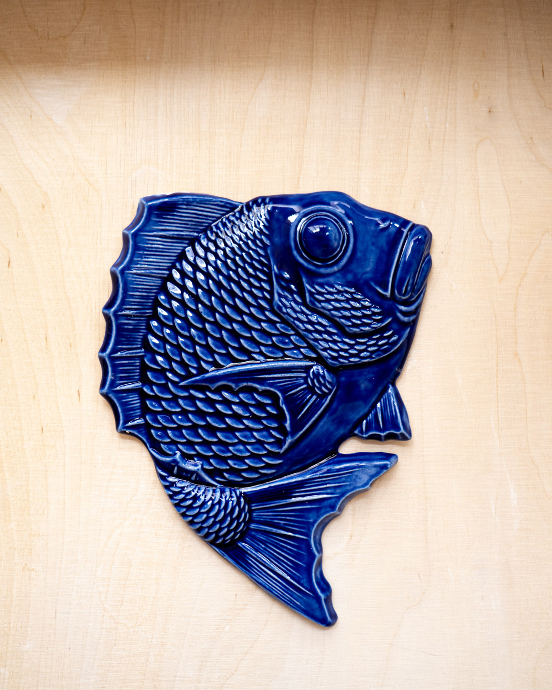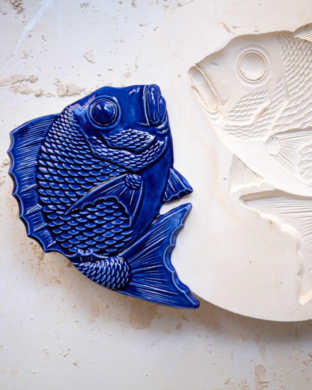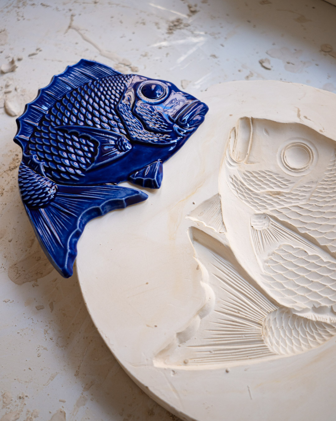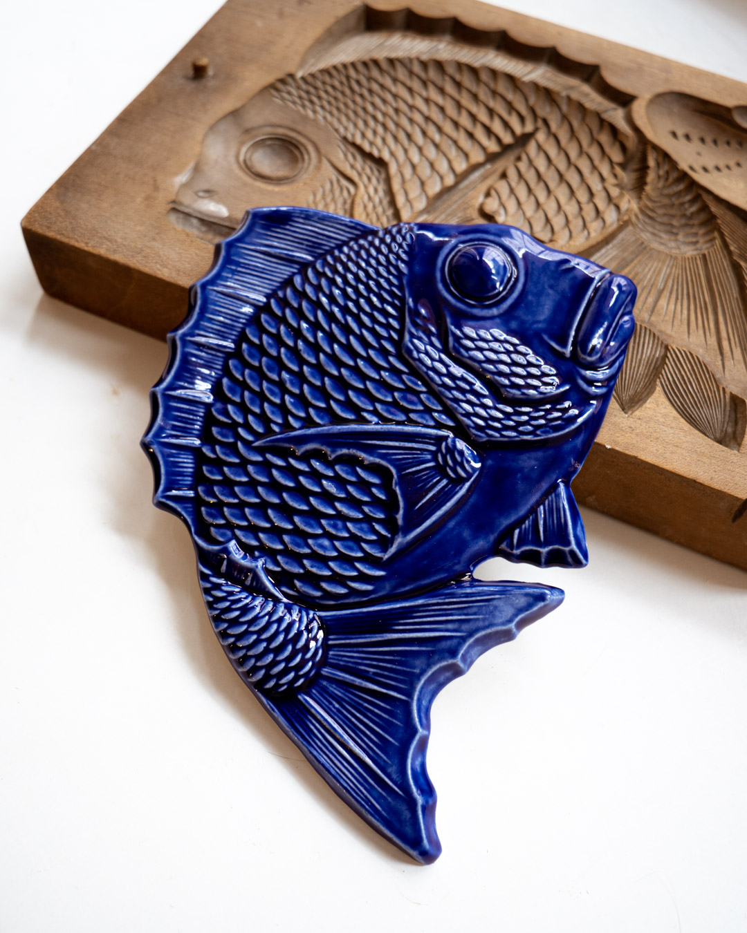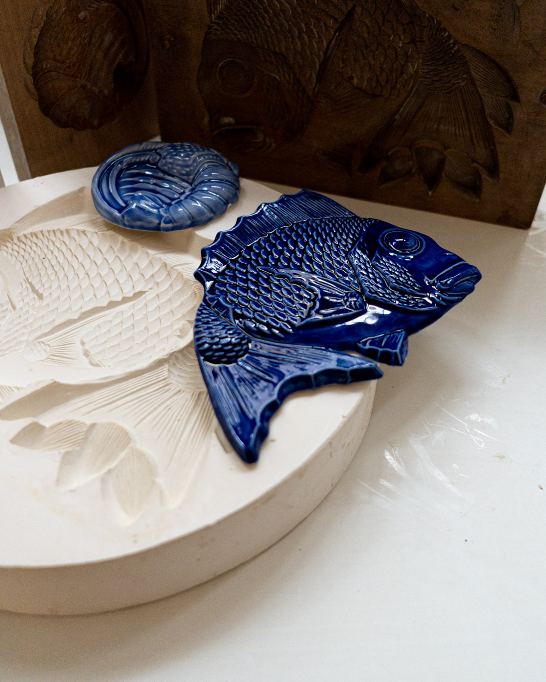 Ryby na ścianę są częścią mojego KASHIGATA PROJECT. Zapoczątkowała go forma na słodycze, którą przywiozłam z Japonii – czyli kashigata. Kiedy w 40-stopniowym upale na targu staroci w Kioto zauważyłam karton z drewnianymi formami, grzebałam w nim jak szalona. Aż w moje ręce wpadł żółw i coś mnie w nim urzekło. Dopiero po powrocie do pracowni zdałam sobie sprawę, że przecież mogę spróbować odlać go w porcelanie. I po kilku nieudanych podejściach i eksperymentach – udało się. Teraz ma swoją gipsową formę z której się rodzi, potem retuszuję go z czułością i szkliwię. Tak powstała seria porcelanowych żółwi MINOGAME (też są do kupienia w sklepie). Kilka miesięcy później pozwoliłam sobie zaszaleć i kupiłam w antykwariacie online jeszcze dwie formy – rybę TAI i krewetkę EBI.