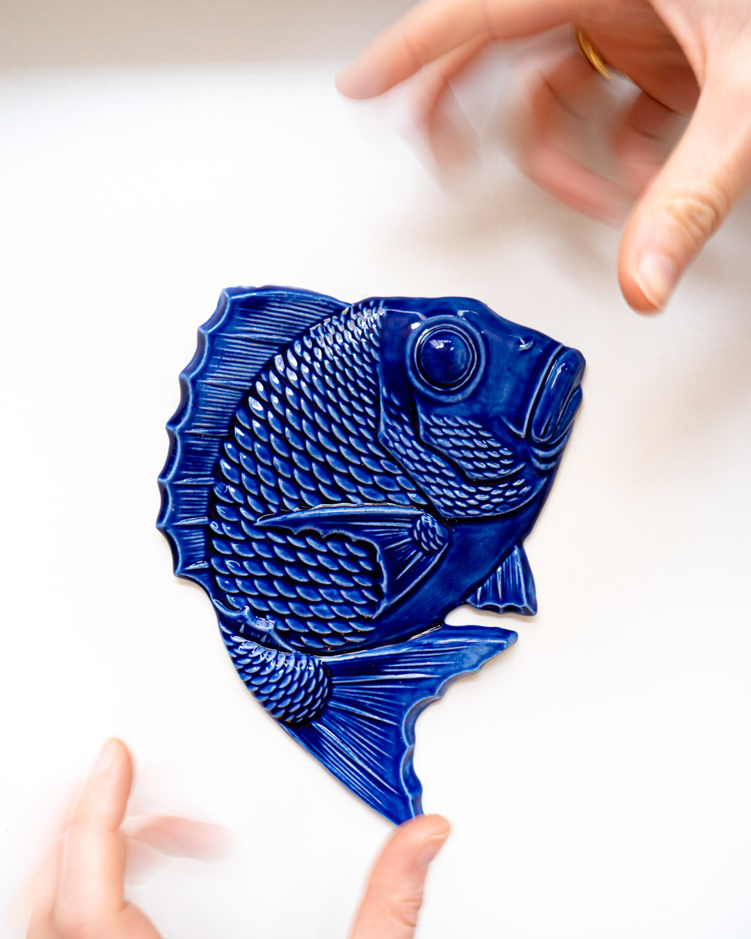 Ryby dostępne są w kilku kolorach: celadon, kobalt, niebieski, różowy, lodowy błękit. Każda z nich ma z tyłu zawieszkę do powieszenia na ścianie. Do każdej dołączam kartkę z jej historią i symboliką- jeśli będzie prezentem, to będzie cudowny dodatek.