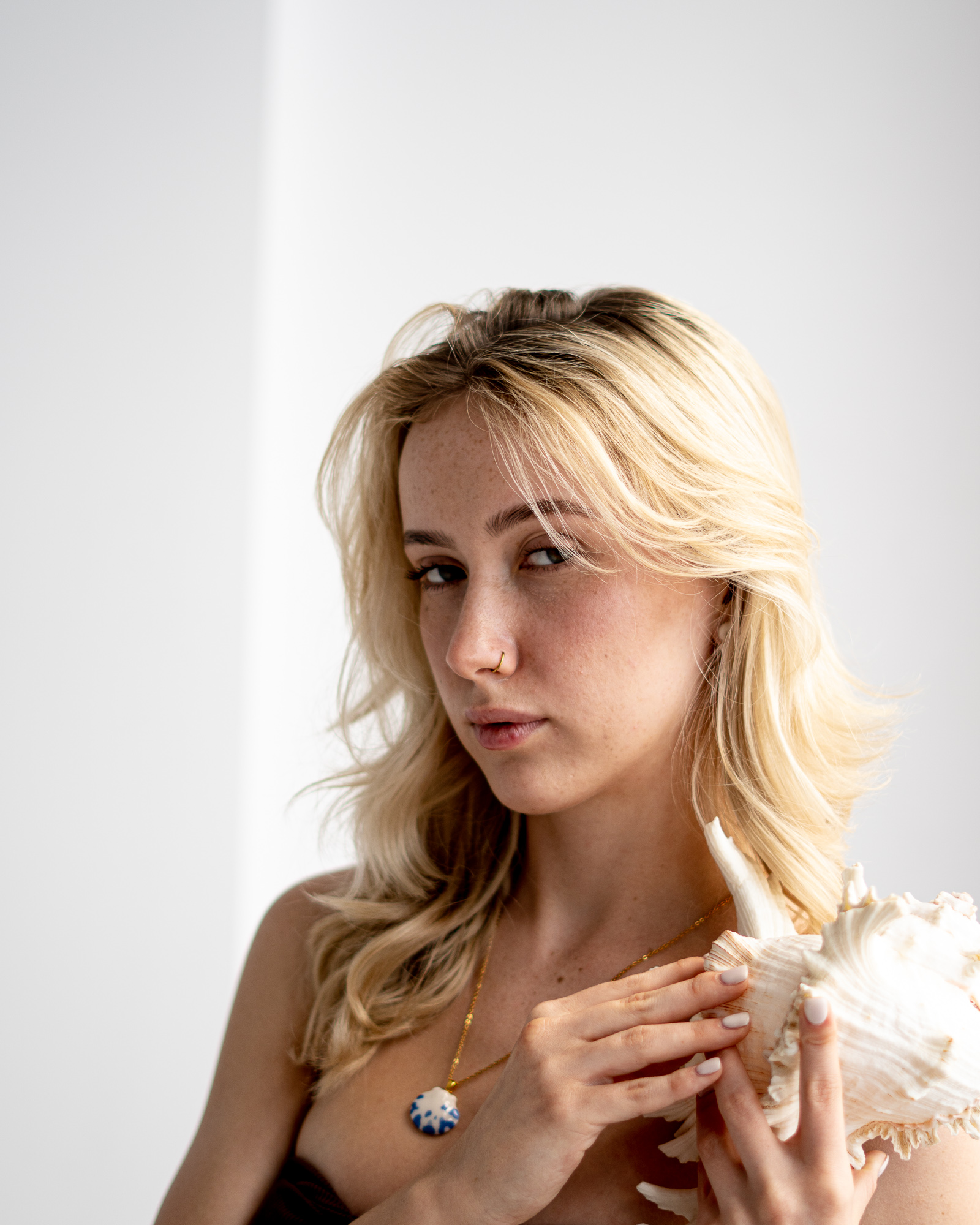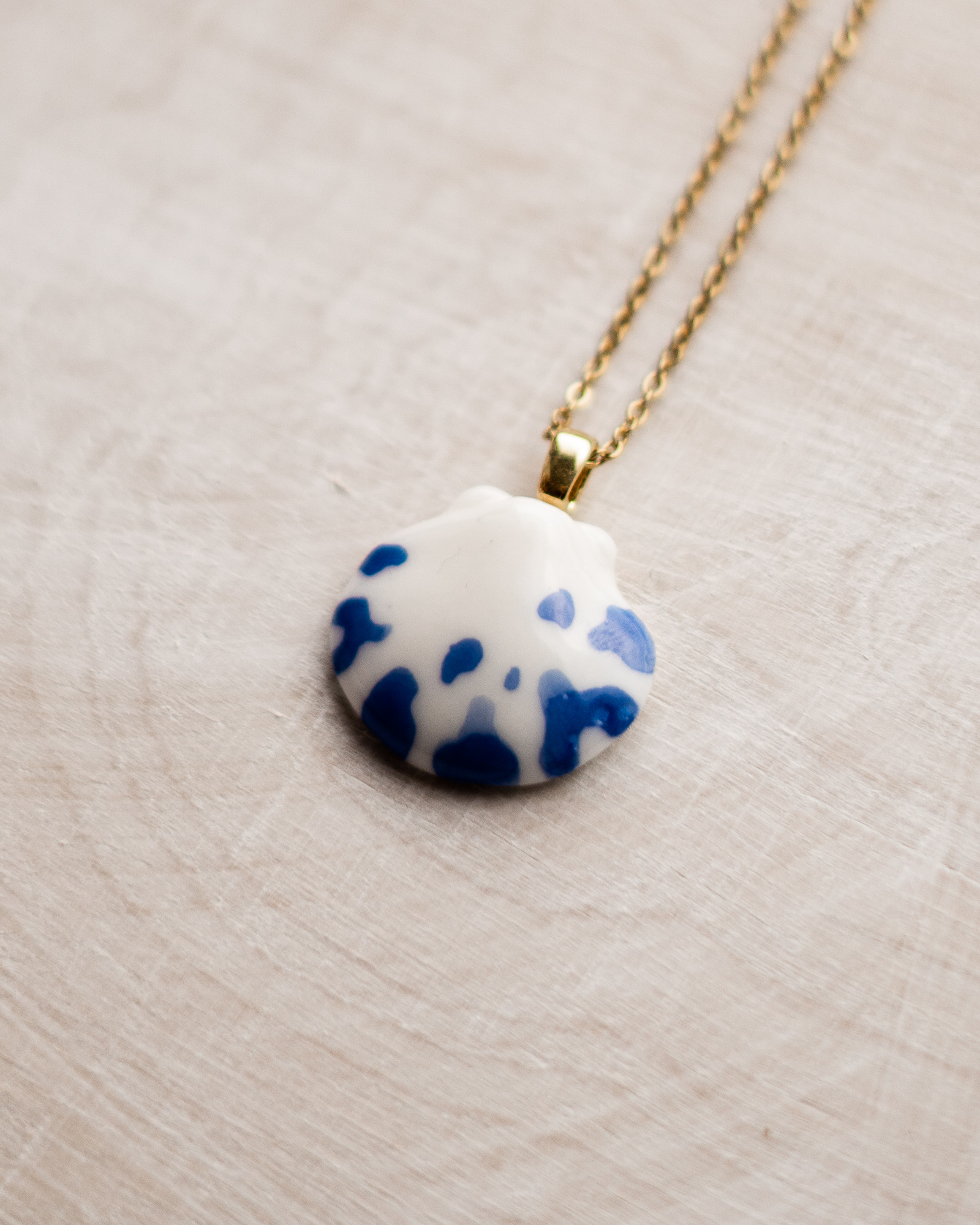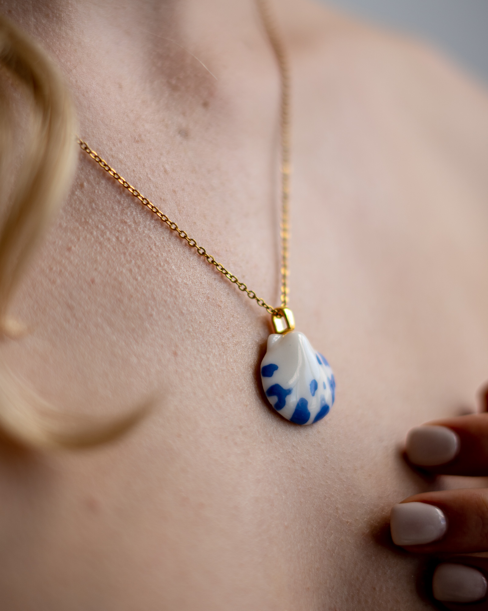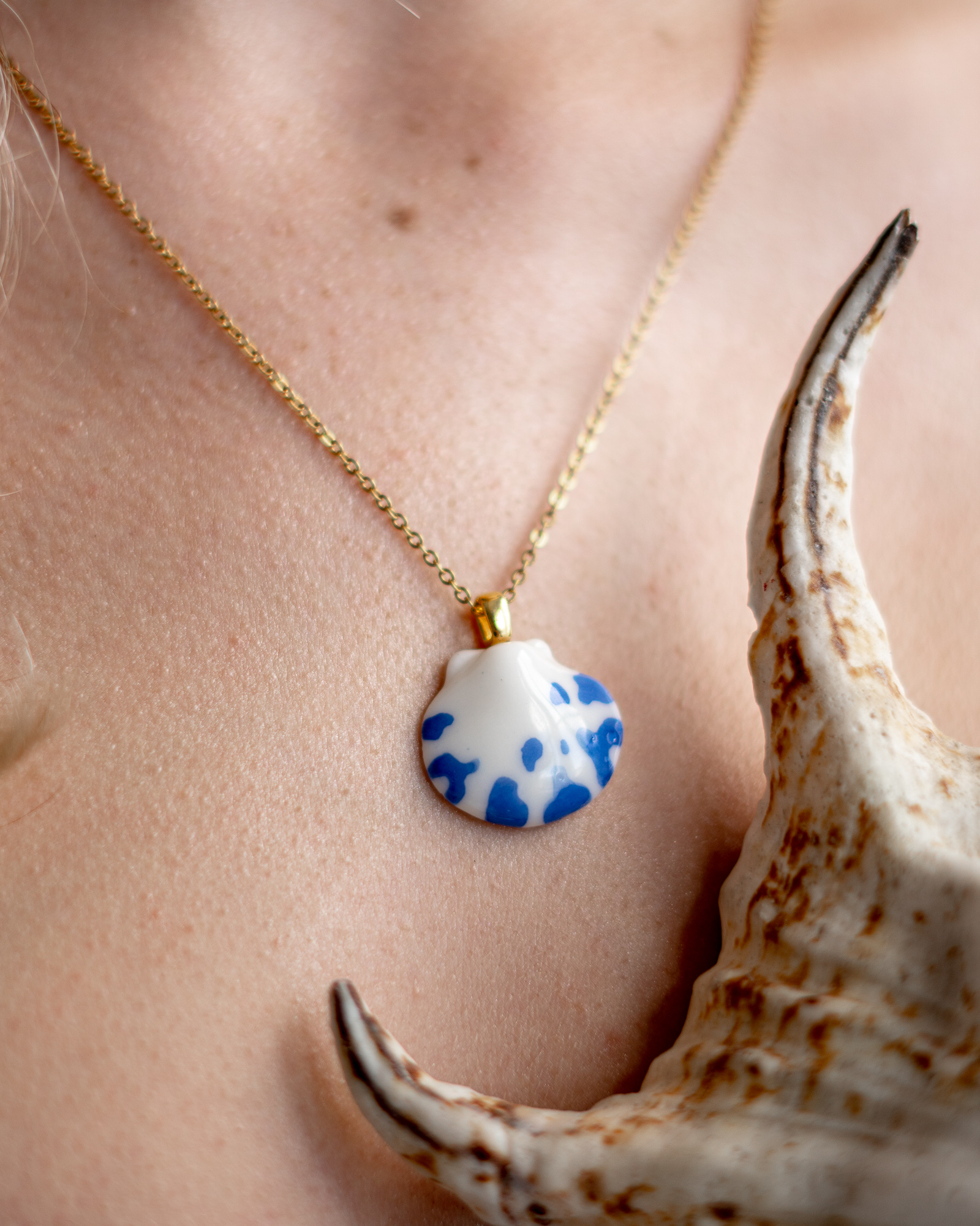 Zawieszka w kształcie muszli ręcznie wykonana z porcelany w pracowni na warszawskiej Pradze. Uformowana, wyszlifowana i szkliwiona z największą starannością i czułością. Wypalona trzykrotnie w piecu ceramicznym w maksymalnej temperaturze 1250 stopni.